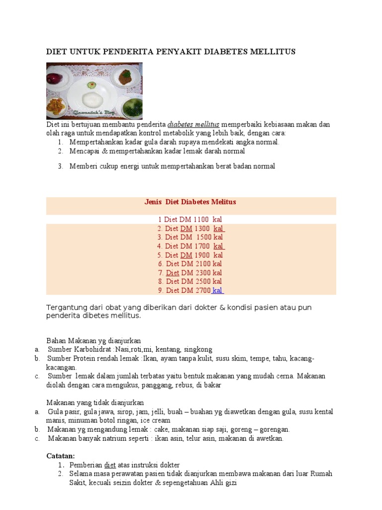 Mau tak mau seorang yang. Selain gula, total kalori pun juga harus dibatasi. Berikut beberapa contoh makanan dibetes yang baik: Pengidap diabetes harus mengetahui makanan apa saja yang dianjurkan untuk dimakan. Isi setengah piring dengan sayur dan buah, dan seperempat bagian isi dengan protein tanpa kandungan lemak seperti ayam, kacang dan ikan panggang. American diabetes association menyarankan untuk memilih sumber protein yang memiliki sedikit lemak jenuh dan kalori. Selain jenis makanan, jumlah makanan yang dikonsumsi juga harus diperhatikan untuk menjaga gizi dan kalori yang tetap seimbang. Makanan untuk penderita diabetes harus diatur dengan baik. Makanan yang baik untuk penderita diabetes diharapkan dapat membantu menurunkan kadar gula darah seorang penderita diabetes. Kalau mengikut cadangan hidangan ideal menu makanan untuk diabetes, mereka perlu mengekalkan untuk mengambil 1800 kcal kalori sehari. Ini kerana ia boleh mempengaruhi dan. Mencukupi asupan serat dengan tepat. Anda seorang pesakit diabetes dan tidak tahu apakah jenis makanan yang boleh dimakan?